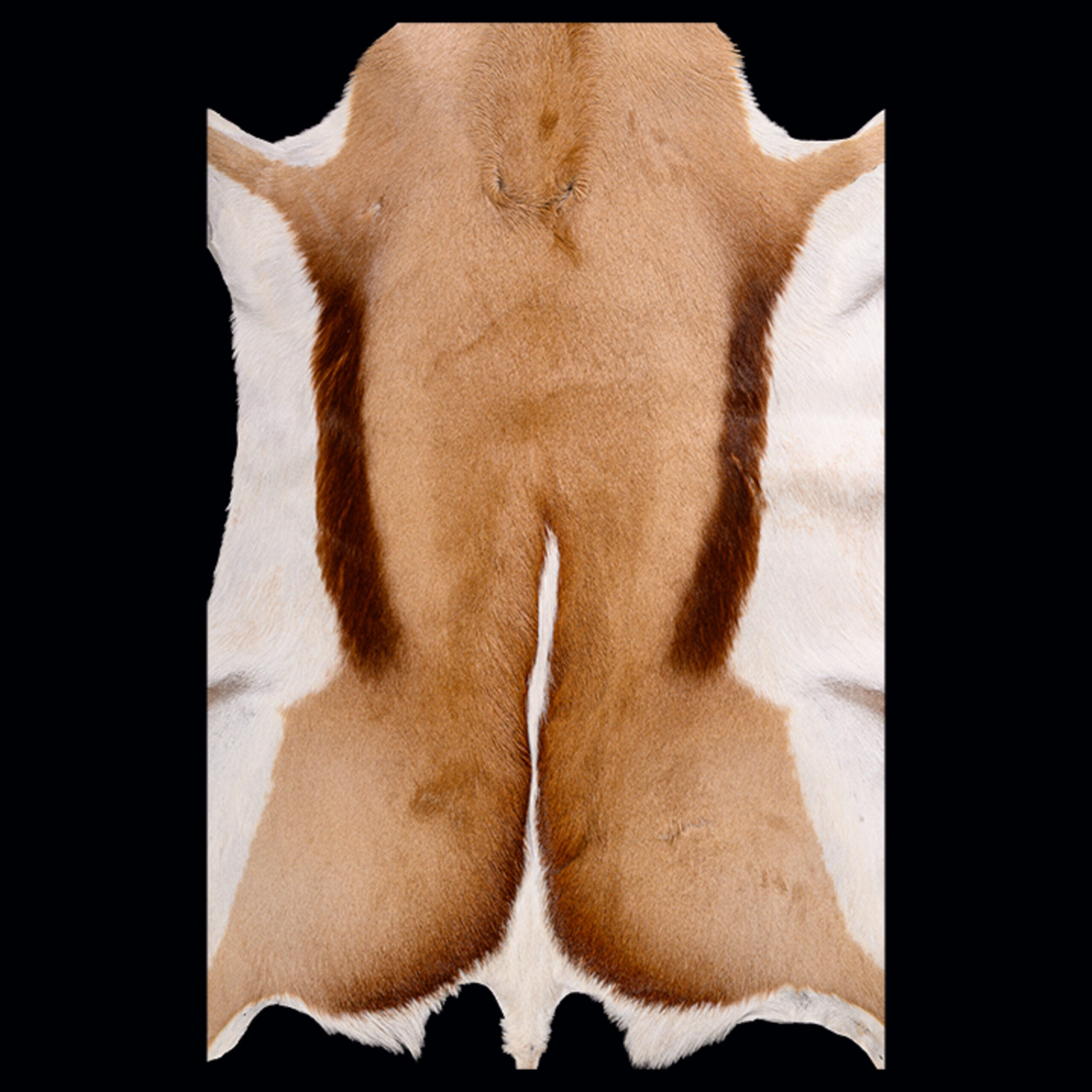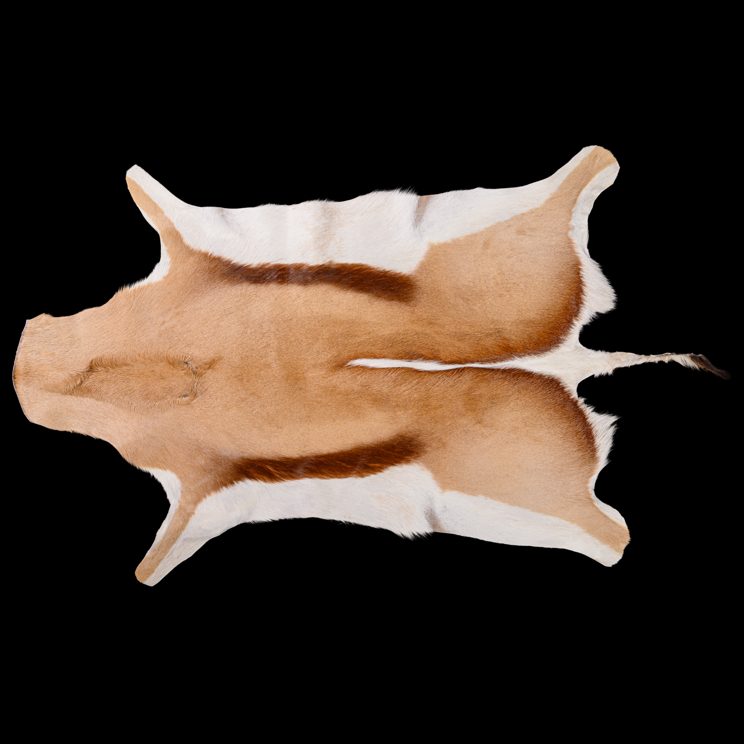 The Springbuck is a slender antelope with long legs and neck. Both sexes reach 71–86 cm (28–34 in) at the shoulder with a head-and-body length typically between 120 and 150 cm (47 and 59 in).The weights for both sexes range between 27 and 42 kg (60 and 93 lb). The tail, 14 to 28 cm (5.5 to 11.0 in) long, ends in a short, black tuft. Dark stripes extend across the white face, from the corner of the eyes to the mouth. A dark patch marks the forehead. In juveniles, the stripes and the patch are light brown. The ears, narrow and pointed, measure 15–19 cm (5.9–7.5 in). Typically light brown, the Springbuck has a dark reddish-brown band running horizontally from the upper foreleg to the edge of the buttocks, separating the dark back from the white underbelly. The tail (except the terminal black tuft), buttocks, the insides of the legs and the rump are all white. Two other varieties – pure black and pure white forms – are artificially selected in some South African ranches. Though born with a deep black sheen, adult black Springbuck are two shades of chocolate-brown and develop a white marking on the face as they mature. White Springbuck, as the name suggests, are predominantly white with a light tan stripe on the flanks. The skin along the middle of the dorsal side is folded in, and covered with 15 to 20 cm (5.9 to 7.9 in) white hair erected by arrector pili muscles (located between hair follicles). This white hair is almost fully concealed by the surrounding brown hairs until the fold opens up, and this is a major feature distinguishing this antelope from gazelles. Springbuck differ from Gazelle in several other ways; for instance, Springbuck have two premolars on both sides of either jaw, rather than the three observed in Gazelle. This gives a total of 28 teeth in the Springbuck, rather than 32 of Gazelle. Other points of difference include a longer, broader, and rigid bridge to the nose and more muscular cheeks in Springbuck, and differences in the structure of the horns.